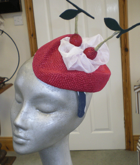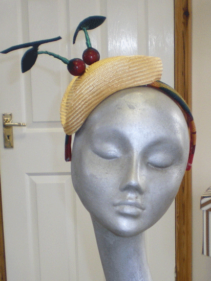 This is ‘Cherry Pie’; a triangular blocked piece of parisisal straw set on a wide tartan covered headband with some (painstakingly) handmade cherries… I liked it so much I also made ‘Cherry Cake’;