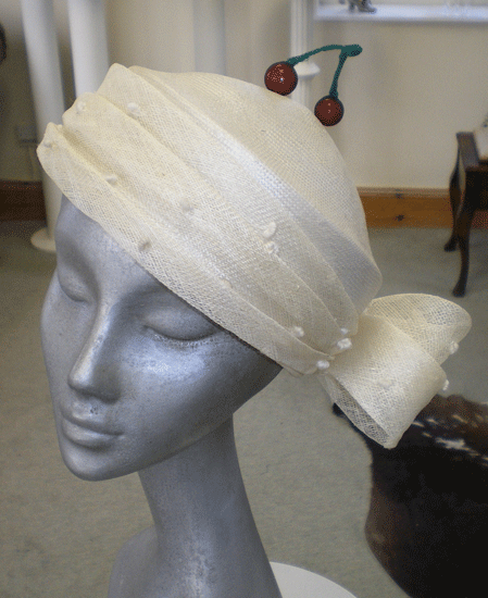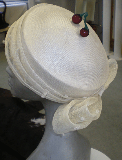 I blocked this parisisal on a toque block and draped it with an unstiffened straw studded with little knots. Originally I intended it for a showroom piece, but I have to say it looks surprisingly flattering on. I restrained myself to two cherries but was tempted to cover the whole structure. The parisisal has a light silver spraying to give it some meringue-crunchy, frosty shine.
