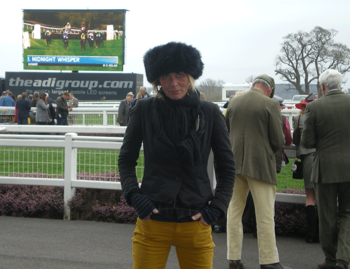 And here’s me looking a bit ‘Pippa Middleton’ with my faux fur band…. I started off the day wearing a straw hat, progressed onto a check tweed baker boy, then a khaki felt, and , as the sun left us and the cold evening arrived, ended up in fur. There was a competition for the best hat and the best dressed lady, but the unpredictable weather had some in coats and macs, some in teeny dresses and high heels, and some in stout tweeds. I was impressed by the brave ladies who sported smart summer day-wear and hats, but felt for them in the chilly air.A great day out and am hoping Jules and I will be able to make Wincanton Ladies Day on 14th May.