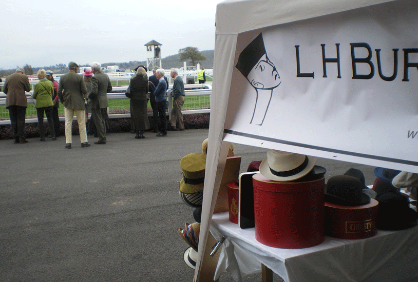 Fun! A chance to meet some new and old customers whilst inspecting the sartorial style of the Ladies and Gentlemen patronising our local racecourse. It was a lovely opportunity to get out of the shop and sport the wares alfresco. A hastily bought gazebo and a smart new banner (both erected by Jules) secured our pitch and the rain held off for an exciting days trading and racing;