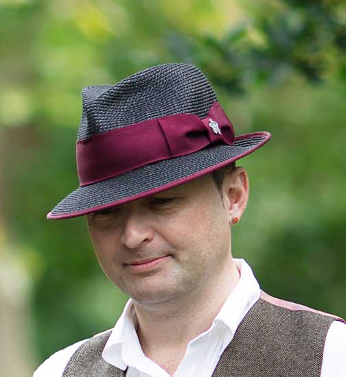 We now stock a range of classic and stylish hats and caps by Christys. There are some splendid fine panama straws, classic fine fur felts and dress hats at around £70-£90, and a range of natty wool felts, straws and caps from the Christys Crown range, which are fashionably styled in vibrant colours, at £35-£40. I have been wearing the wine-trimmed black straw shown below;